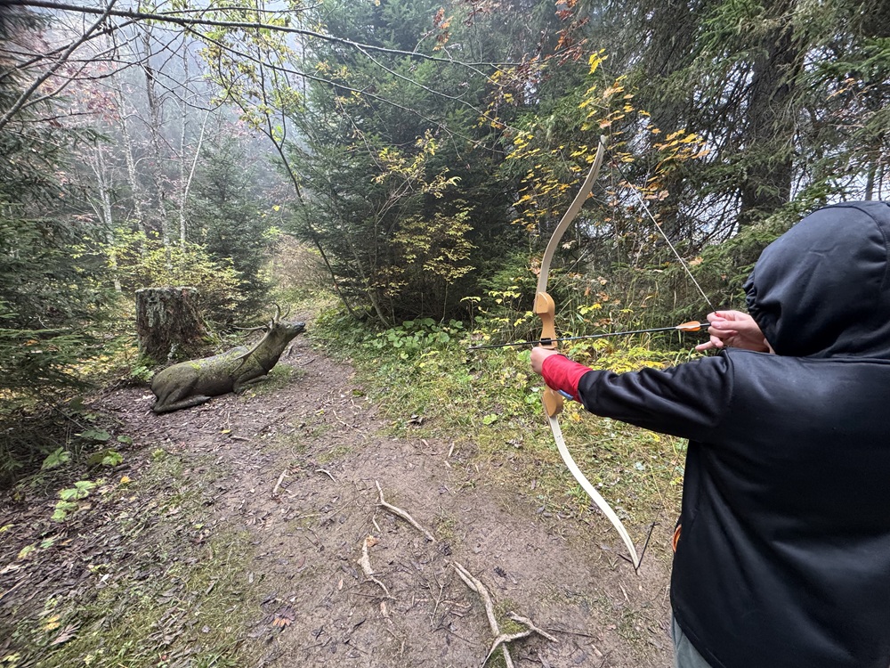 Le départ se fait à la cabane à côté du téléski du Géant. Le monsieur explique d’abord comment tenir l’arc et nous pouvons faire autant d’essai de possible pour atteindre notre cible, avant de partir pour le parcours.