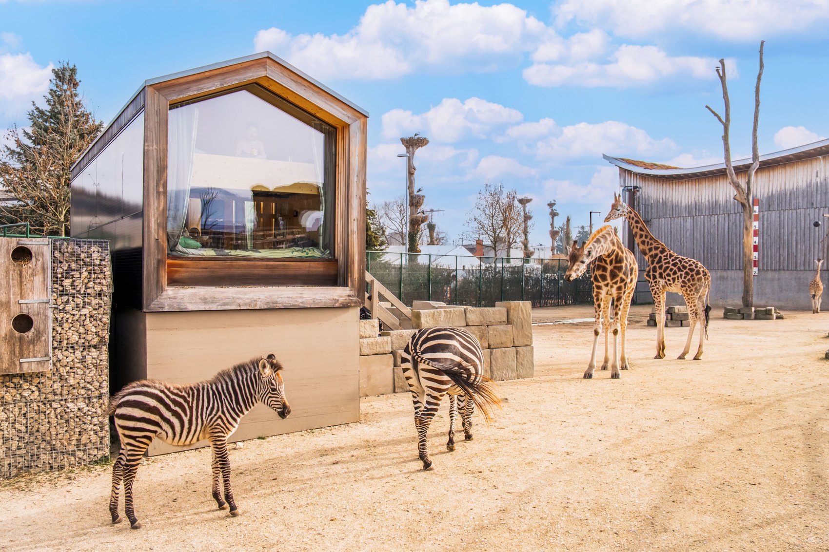 Compris : la nuit, les boissons et snacks du minibar compris, petit déjeuner livré, moment avec la soigneuse pour nourrir les girafes, et les entrées au zoo.